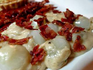 Crisp up the bacon in a large frying pan, set aside to drain, then chop roughly. Slowly add flour to rendered bacon fat and whisk over medium heat until smooth and thick, almost a paste like consistency. Let the flour mixture brown a little in the pan until golden, then add chicken broth and Culinary Brandy. Whisk until smooth and thick. Add cream and continue to whisk. Add chives, cayenne, salt, and black pepper and stir to incorporate. Add onions and cook mixture for another 10 minutes or until onions are completely fork tender. Top with more chives and chopped bacon.